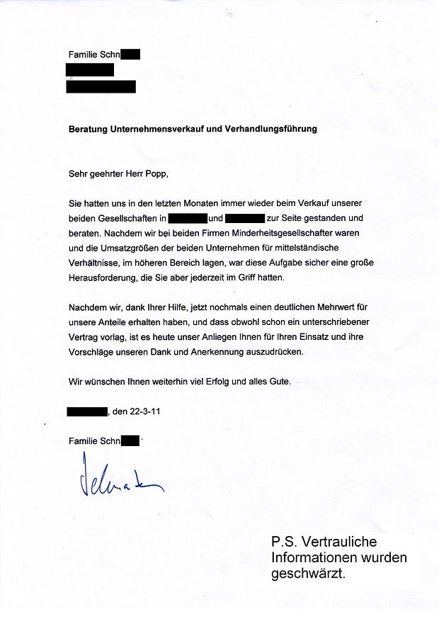 With detailed analyses, specific company valuation methods and accordingly derived strategies, we were able to generate relevant arguments, steps and measures which ultimately helped our client to achieve his objectives. The client forwarded us his gratitude in the attached letter. We have blanked all confidential information upon request of the family.