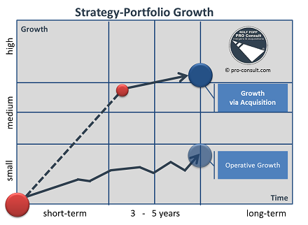 The consideration of operative or external growth via company purchase, participation, co-operation or joint venture should be done carfully and periodically. Additionally, the building of further growth potential has to be considered especially in case of a company purchase and a strategic partnership.